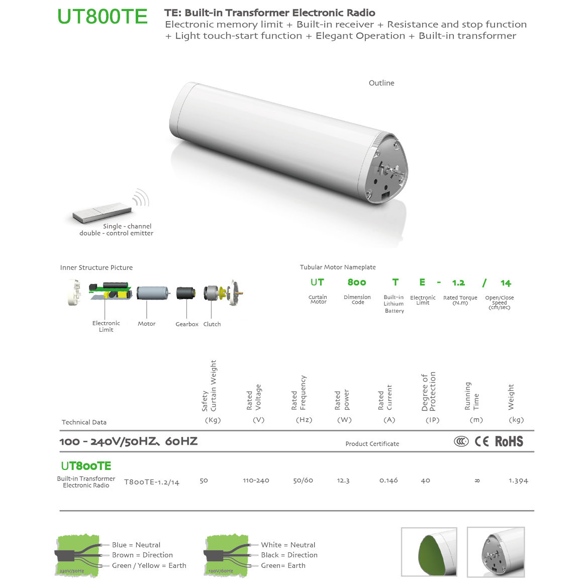 Built-in Transformer(100V-240V)+Elegant operation+Memorized Limit+Integrated Radio Control+Obstruction Detection+Light touch-start+Manual Override+The third limit position+Compatible with dry contact switch function.